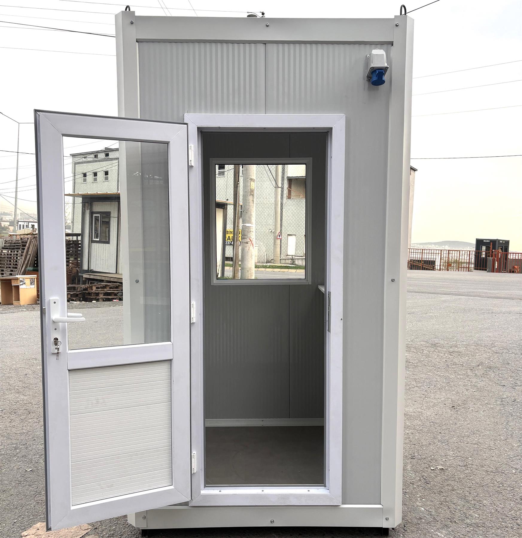 Brand new, durable, and fully insulated, with dimensions of approximately 130x130 cm (4'3" X 4'3" X 7'9"). Perfectly versatile for a wide range of uses, including gatehouses, car park attendants, ticket kiosks, information points, catering units, security cabins, offices, welfare units, coffee or beverage shops, and more. Ideal for outdoor events or surveillance at locations such as construction sites, industrial areas, and commercial premises.