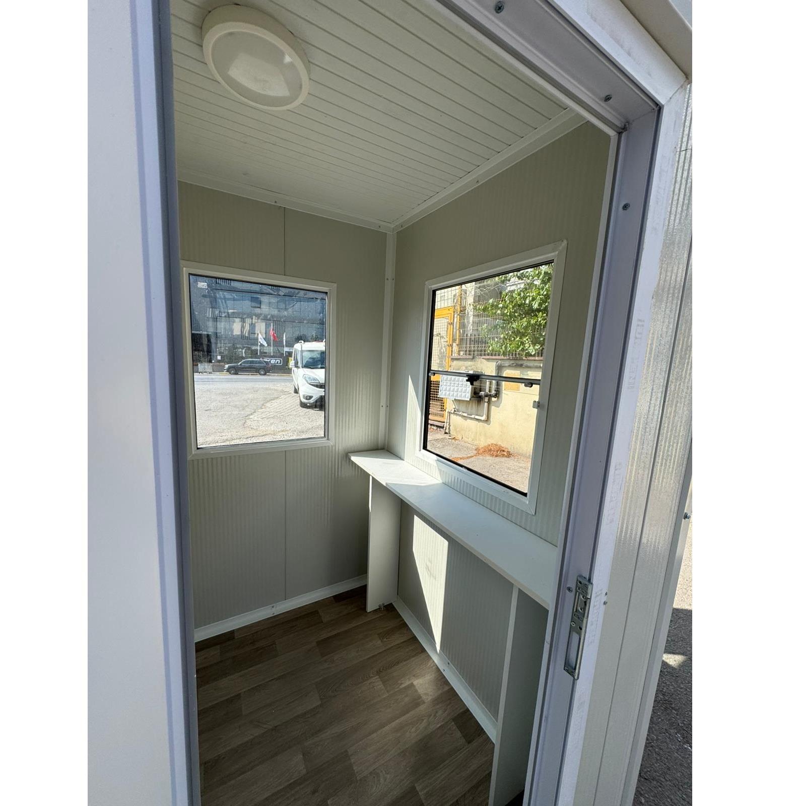 Equipped with upward sliding and fixed windows, an internal reception desk, PVC flooring, LED lighting, and a lockable door. For optimal use, it is recommended to place it on a concrete base or steel beams, providing a cost-effective alternative to traditional constructions.